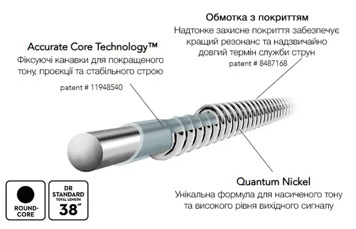 Струни DR виробляються у Вествуді, штат Нью-Джерсі. Ми використовуємо тільки найкращі матеріали американського виробництва, починаючи з сердечника та обмотувального дроту, закінчуючи кульковими наконечниками та закінчуючи фінальною упаковкою. Коли хтось бачить логотип DR – він отримує найкраще!