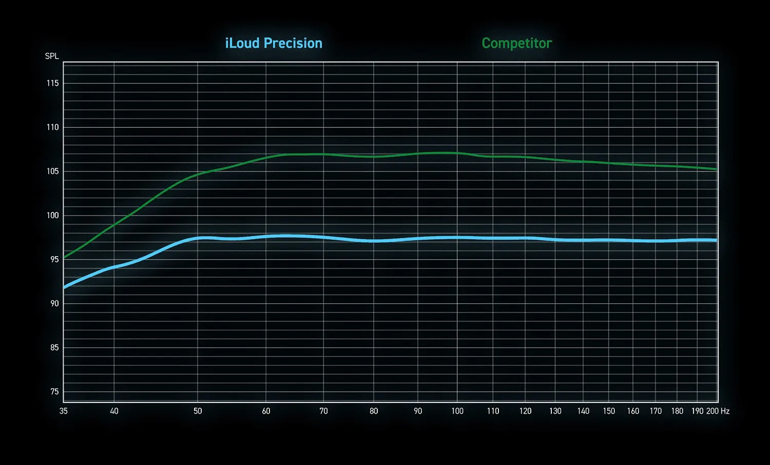 iLoud Precision досягає 36 Гц при -4 дБ (і всього 30 Гц при включеному калібруванні ARC), забезпечуючи потужний, контрольований бас без шуму та розмиття. Вбудований регульований спад низьких частот забезпечує ідеальну інтеграцію із сабвуфером без необхідності використання зовнішніх кросоверів.