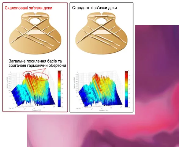 Фахівці Yamaha відмовилися від сліпого наслідування традицій і провели безліч аналітичних тестів і експериментів заради отримання найкращої конструкції зв'язок верхньої деки. Завдяки цьому була створена абсолютно нова модель скалопованих зв'язок задля отримання ідеальної акустичної конструкції, що поєднує чудову надійність і відмінну якість звуку.