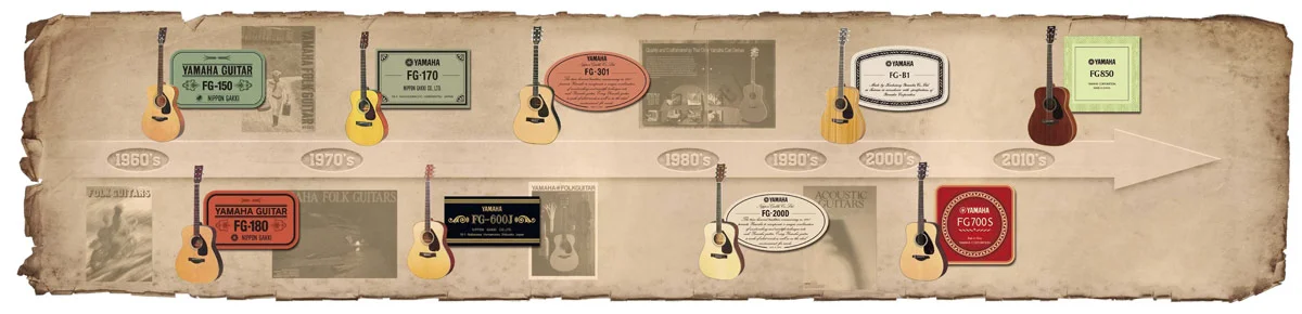 Історія акустичних гітар Yamaha серії FG почалася в 1966 році з виходом моделей FG180 і FG150. Протягом наступних 50-ти років було розроблено та вироблено кілька поколінь гітар, і кожна з них була ідеальним інструментом для тогочасних музикантів. В цілому, з 1966 року було випущено більше 200 моделей серії FG та FS.